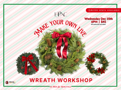 Celebrate the season with a festive Make Your Own Live Wreath night! You’ll be guided through the process of designing and decorating your own fresh wreath, complete with a variety of holiday accents to make it uniquely yours. This relaxed, creative gathering is perfect for friends, families, or anyone looking to add a personal touch to their holiday décor!