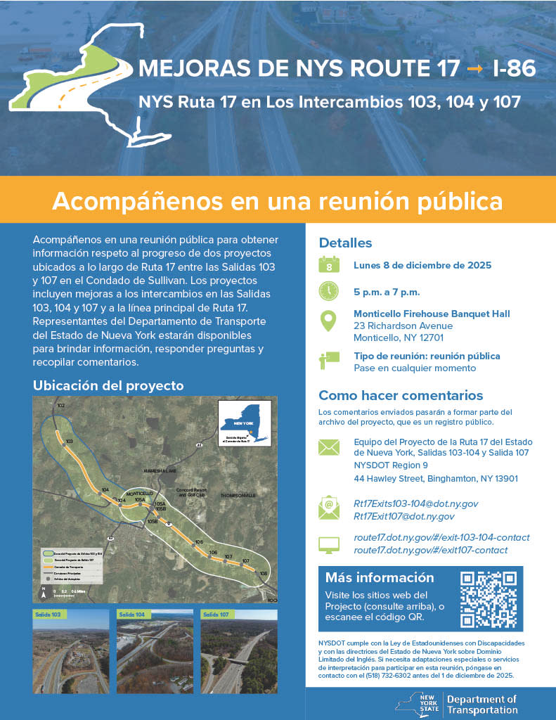 Project representatives will be available to discuss questions and concerns from the community about proposed upgrades. There will be no formal presentation, but project staff will have illustrative boards available for public review. After the meeting, the presentation materials will be posted to the project websites at: https://www.route17.dot.ny.gov/#/exits-103-104 and https://www.route17.dot.ny.gov/#/exit-107.