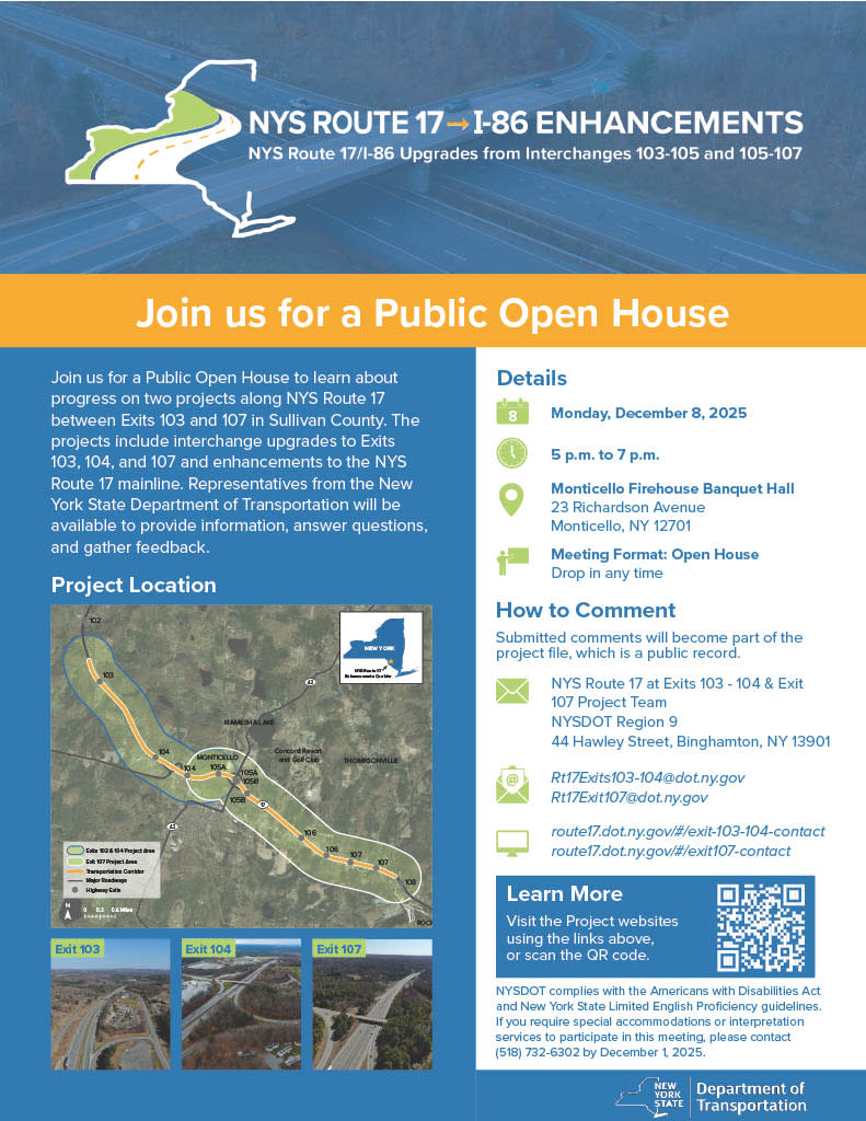 Join us for a Public Open House to learn about progress on two projects along NYS Route 17 between Exits 103 and 107 in Sullivan County. The projects include interchange upgrades to Exits 103, 104, and 107 and enhancements to the NYS Route 17 mainline. Representatives from the New York State Department of Transportation will be available to provide information, answer questions, and gather feedback.
