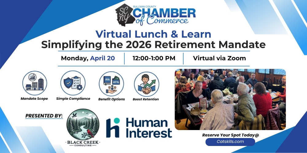 New York State’s 2026 Retirement Mandate is approaching, and understanding what it means for your organization is essential. This engaging session, presented by Black Creek Consulting and Human Interest, will break down the requirements in a clear, practical way tailored specifically for Sullivan County employers.