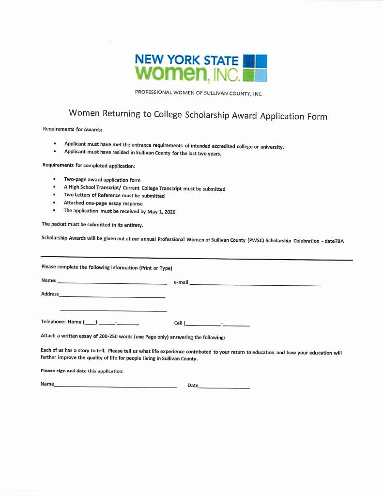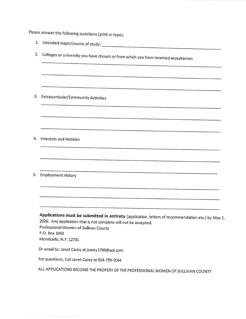 All applicants must be high school seniors, be accepted for enrollment in a college or university for the Fall 2026 semester, and be full-time residents of Sullivan County for at least 2 years. Home schooled students are welcome to apply. High school girls can contact their guidance counselor for applications. Women returning to school can get information and applications by contacting Amy Colon by email at acolon@sunysullivan.edu.