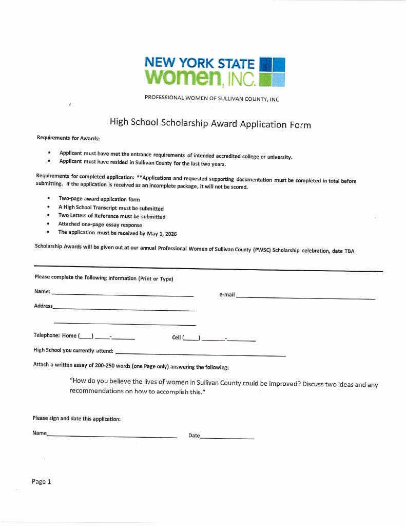 Professional Women of Sullivan County, Inc. is offering scholarships, each in the amount of $500 dollars, to high school seniors pursuing higher education. PWSC is particularly looking for young women who excel academically, are well- rounded, and are committed to community service and civic engagement.